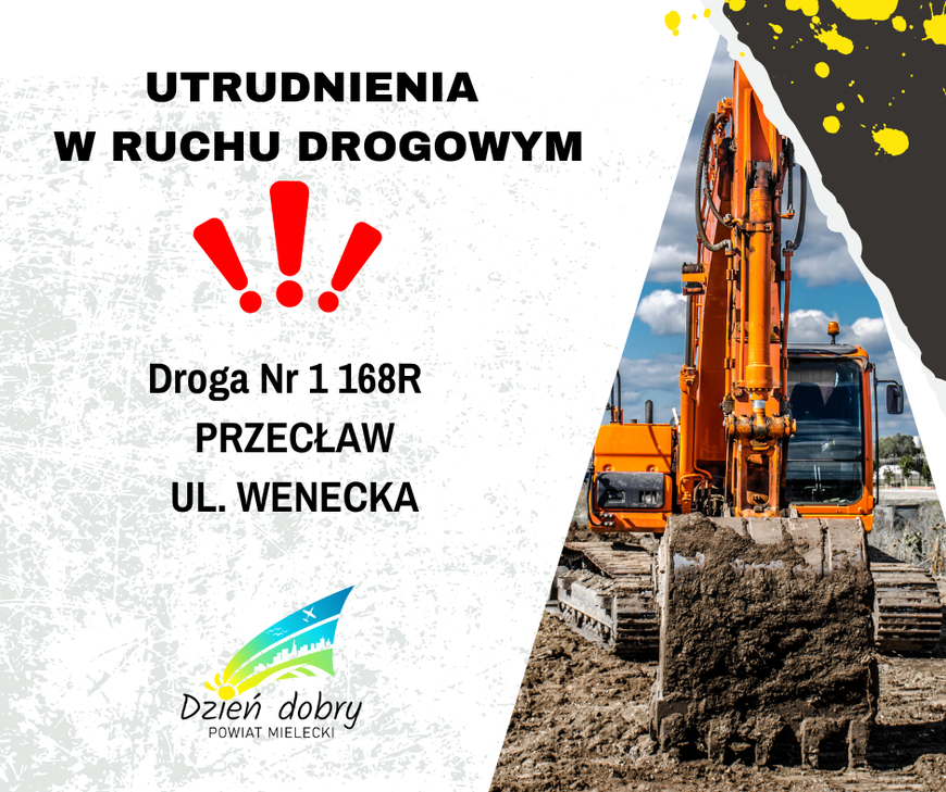 Powiatowy Zarząd Dróg w Mielcu informuje, że od dnia 02.10.2025 r. (czwartek) w godz. 7.00 do 18.00 odcinek drogi powiatowej Nr 1 168R - ul. Wenecka w m. Przecław zostanie zamknięty dla ruchu.