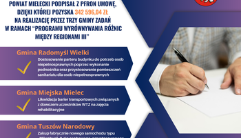 Powiat Mielecki podpisał umowę z Państwowym Funduszem Rehabilitacji Osób Niepełnosprawnych na realizację Programu Wyrównywania Różnic Między Regionami III w roku 2025. Pozyskane środki, w wysokości 342 596,04 zł, pozwolą na realizację przez gminy z terenu Powiatu Mieleckiego łącznie trzech projektów w ramach ww. programu.