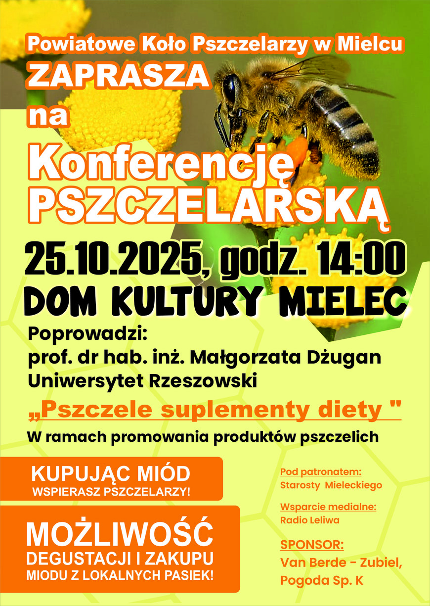 Powiatowe Koło Pszczelarzy w Mielcu zaprasza Mieszkańców na specjalistyczną Konferencję Pszczelarską, która odbędzie się 25 października 2025 r. w Samorządowym Centrum Kultury w Mielcu.